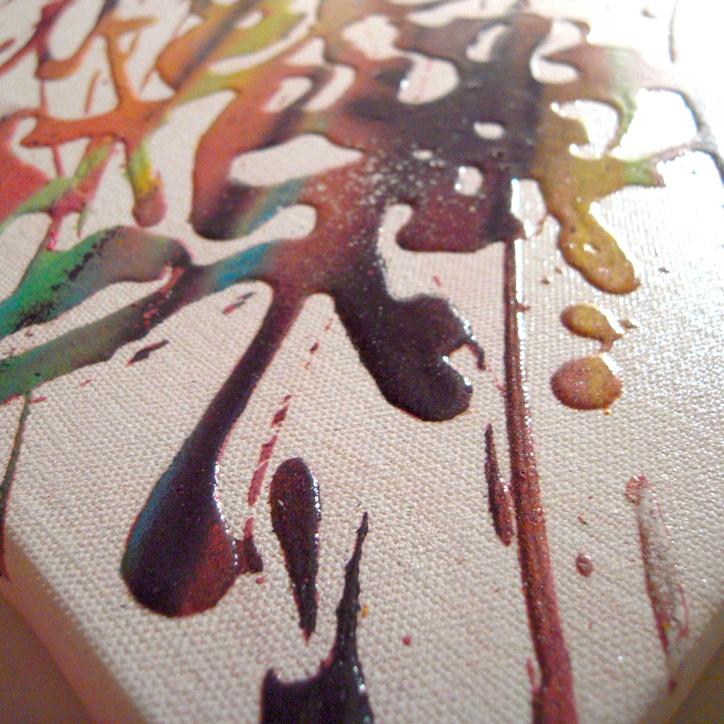Peinture aérosol, résine aqueuse, vernis brillant sur toile coton.